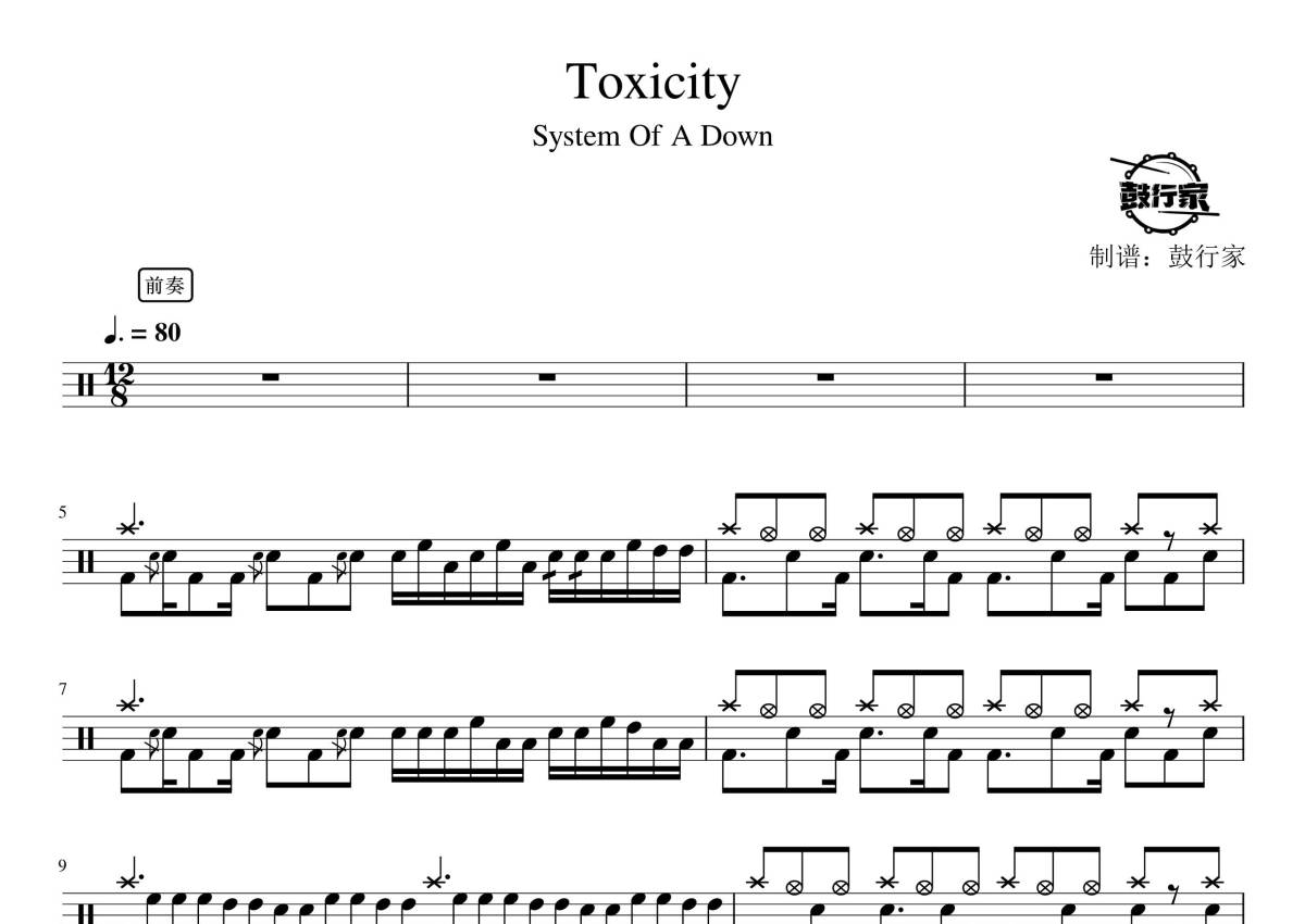 《Toxicity》是System Of A Down演唱的一首歌曲,拍号为4/4拍,歌曲速度为每分钟80拍,这份鼓谱共有四张高清图谱,图谱由 @鼓行家 编配上传,图谱使用五线谱编配,使用这份Toxicity架子鼓谱,你将能够轻松地敲打出这首System Of A Down的Toxicity,快来尝试吧。