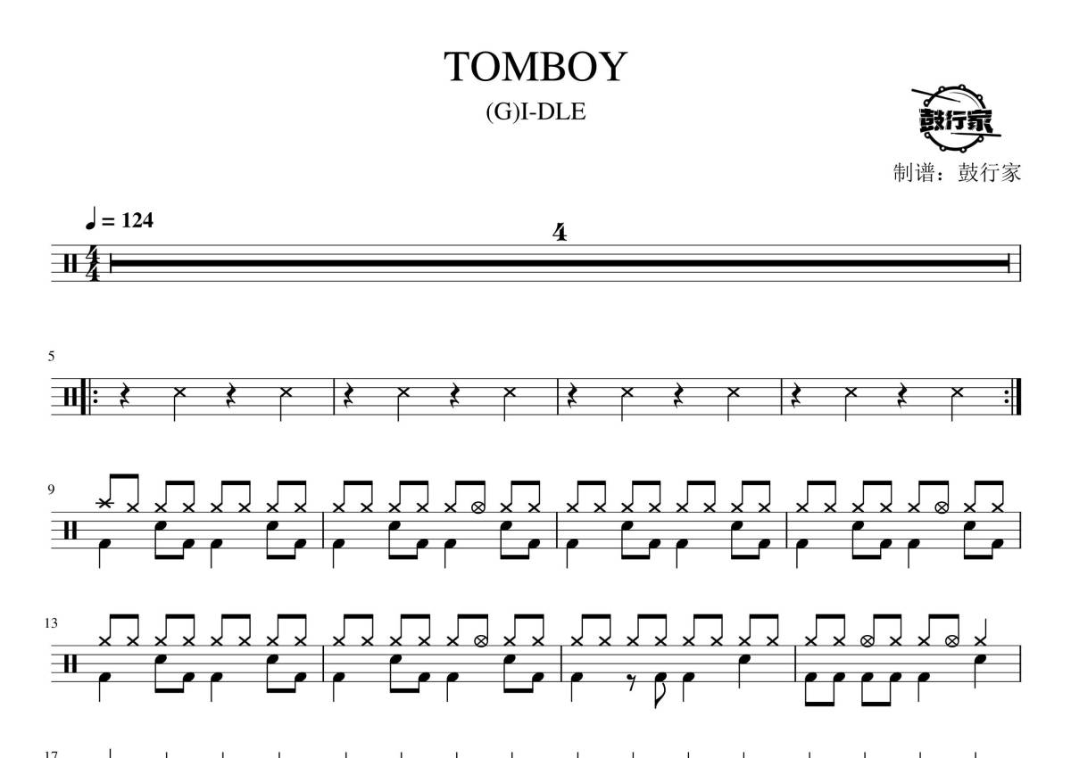 《TOMBOY》是(G)I-DLE演唱的一首歌曲,拍号为4/4拍,歌曲速度为每分钟124拍,这份鼓谱共有两张高清图谱,图谱由 @鼓行家 编配上传,图谱使用五线谱编配,使用这份TOMBOY架子鼓谱,你将能够轻松地敲打出这首(G)I-DLE的TOMBOY,快来尝试吧。