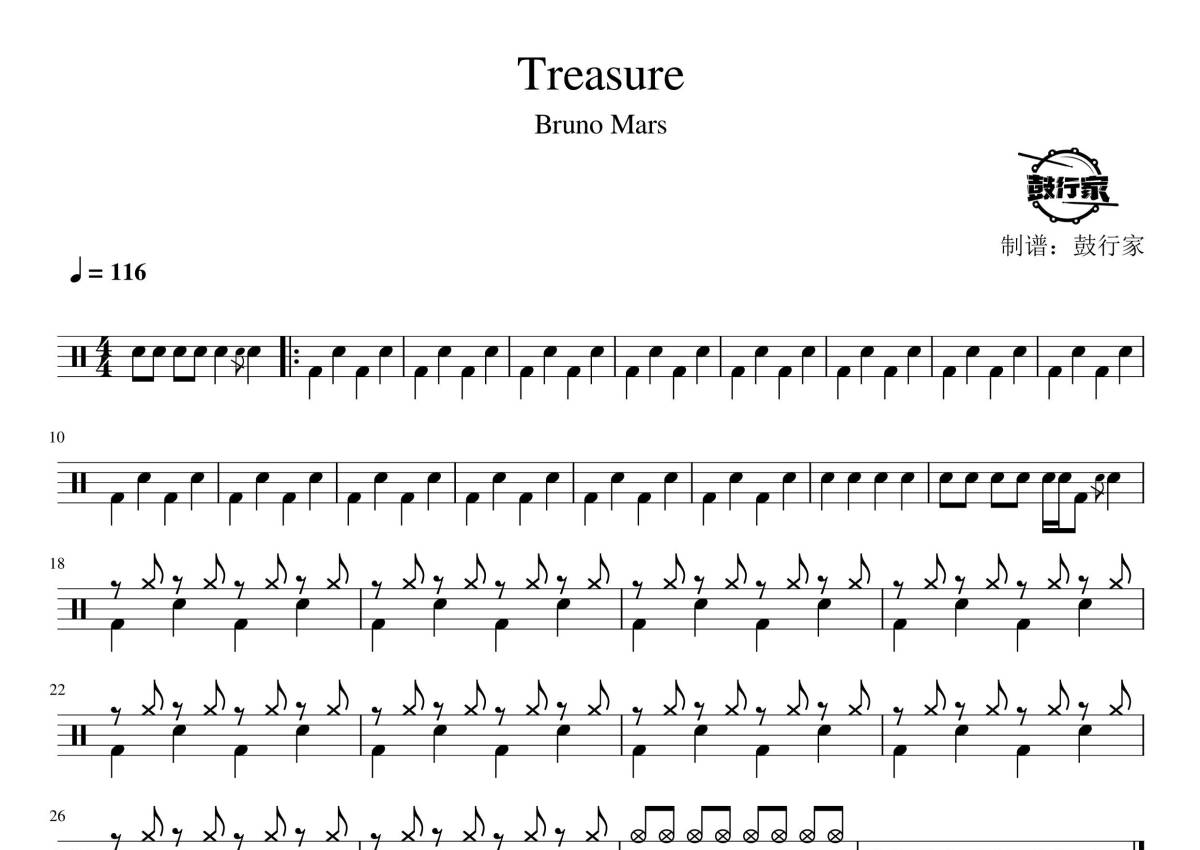《Treasure》是Bruno mars演唱的一首歌曲,拍号为4/4拍,歌曲速度为每分钟116拍,这份鼓谱共有一张高清图谱,图谱由 @鼓行家 编配上传,图谱使用五线谱编配,使用这份Treasure架子鼓谱,你将能够轻松地敲打出这首Bruno mars的Treasure,快来尝试吧。