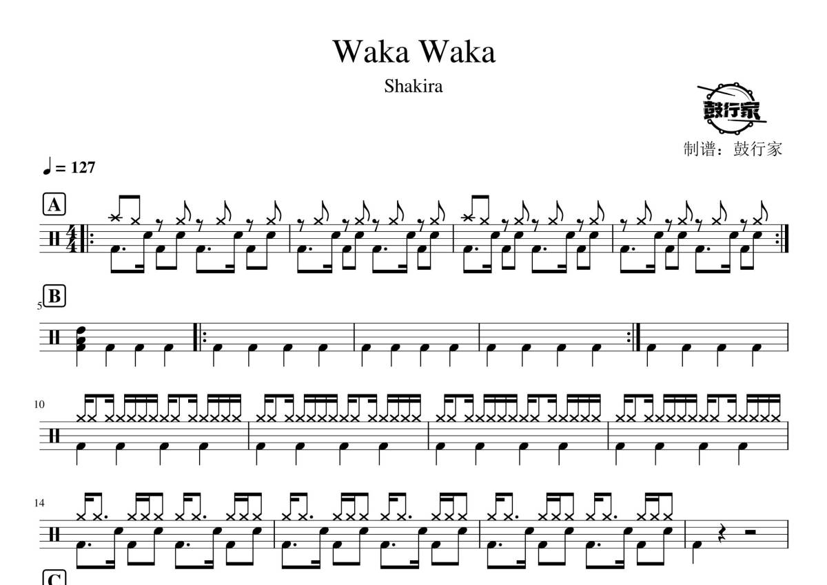 《Waka Waka》是Shakira演唱的一首歌曲,拍号为4/4拍,歌曲速度为每分钟127拍,这份鼓谱共有两张高清图谱,图谱由 @鼓行家 编配上传,图谱使用五线谱编配,使用这份Waka Waka架子鼓谱,你将能够轻松地敲打出这首Shakira的Waka Waka,快来尝试吧。