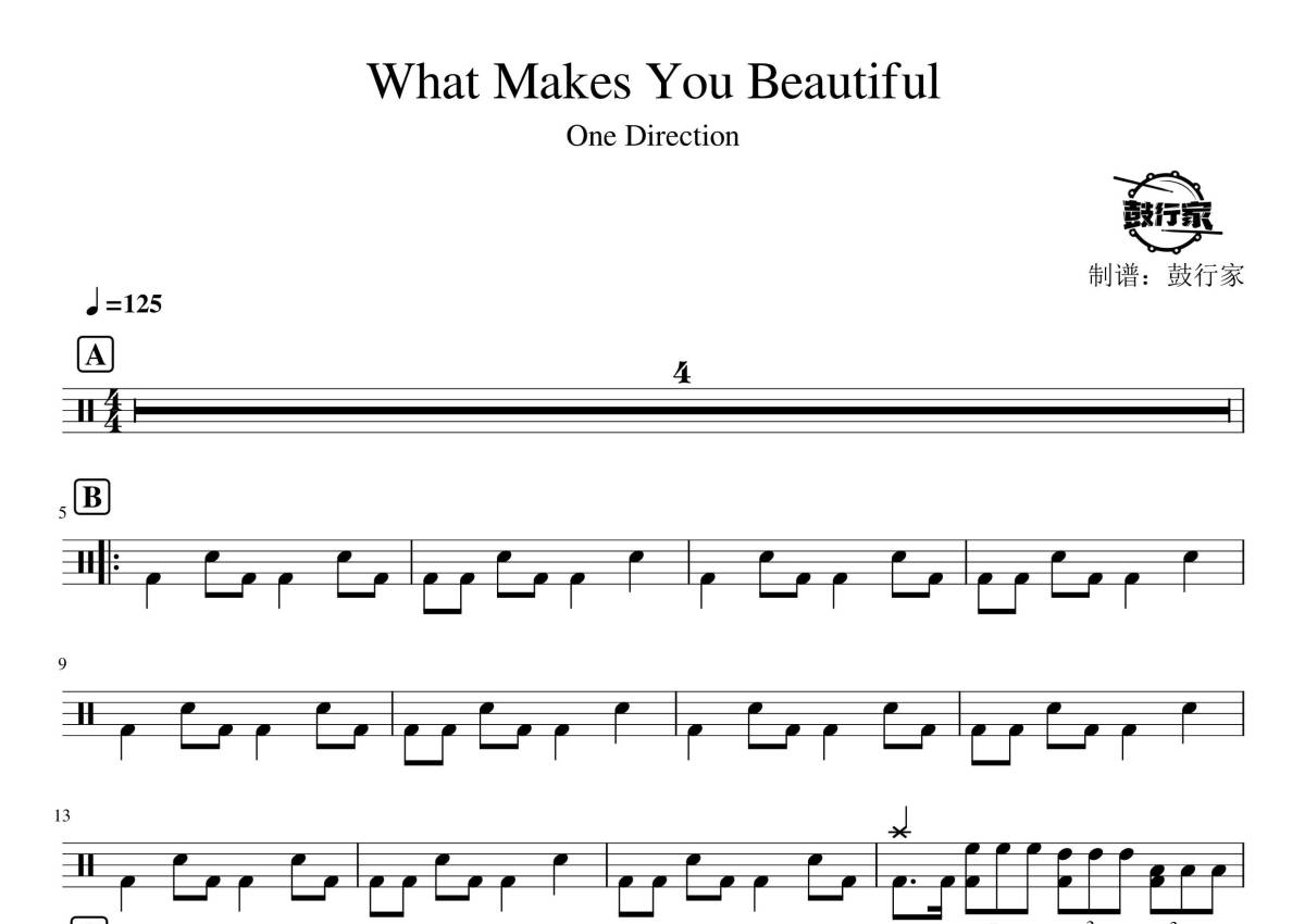 《What Makes You Beautiful》是One Direction演唱的一首歌曲,拍号为4/4拍,歌曲速度为每分钟125拍,这份鼓谱共有两张高清图谱,图谱由 @鼓行家 编配上传,图谱使用五线谱编配,使用这份What Makes You Beautiful架子鼓谱,你将能够轻松地敲打出这首One Direction的What Makes You Beautiful,快来尝试吧。