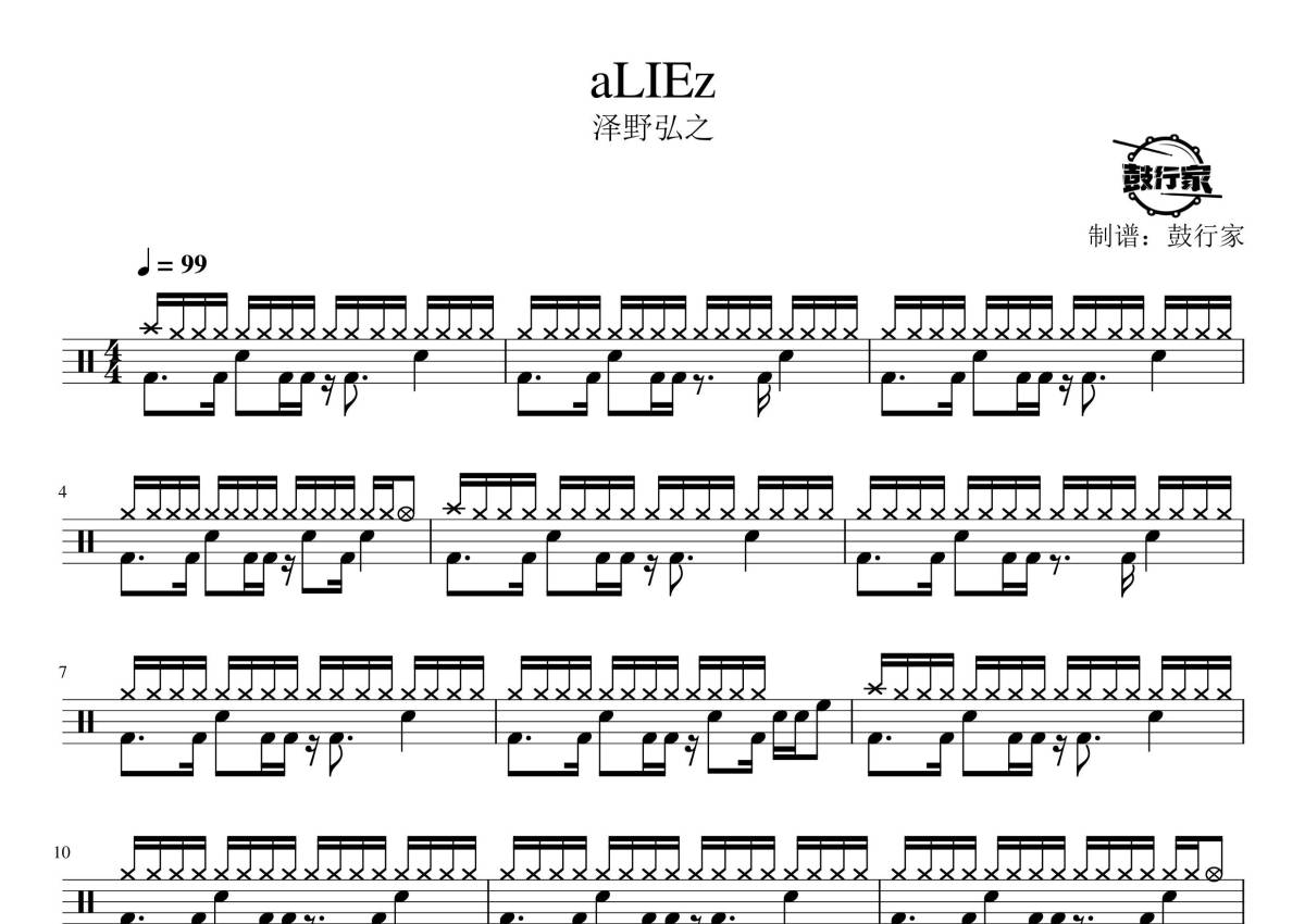 《aLIEz》是泽野弘之演唱的一首歌曲,拍号为4/4拍,歌曲速度为每分钟99拍,这份鼓谱共有四张高清图谱,图谱由 @鼓行家 编配上传,图谱使用五线谱编配,使用这份aLIEz架子鼓谱,你将能够轻松地敲打出这首泽野弘之的aLIEz,快来尝试吧。
