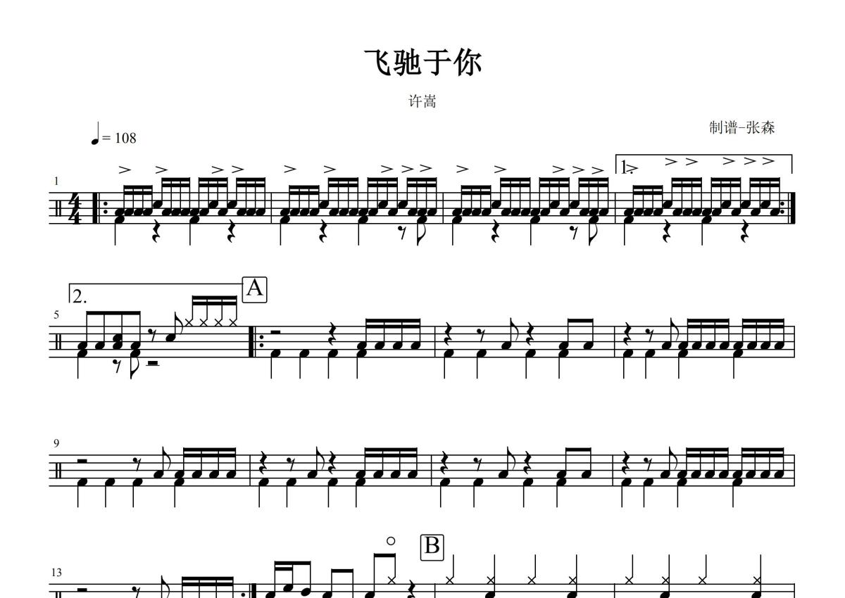 《飞驰于你》是许嵩演唱的一首歌曲,这份鼓谱共有三张高清图谱,图谱由 @打鼓谱 编配上传,图谱使用五线谱编配,使用这份飞驰于你架子鼓谱,你将能够轻松地敲打出这首许嵩的飞驰于你,快来尝试吧。《飞驰于你》是许嵩作词、作曲、编曲并演唱的歌曲,作为QQ飞车手游敦煌版本主题曲。