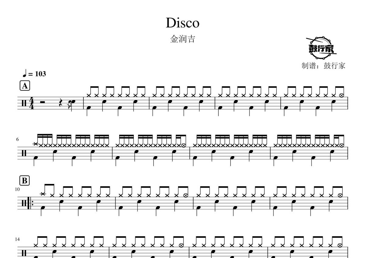 《disco》是金润吉演唱的一首歌曲,拍号为4/4拍,歌曲速度为每分钟103拍,这份鼓谱共有两张高清图谱,图谱由 @鼓行家 编配上传,图谱使用五线谱编配,使用这份disco架子鼓谱,你将能够轻松地敲打出这首金润吉的disco,快来尝试吧。