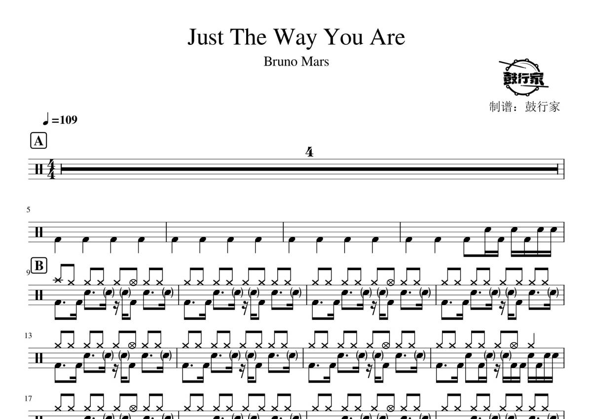 《just the way you are》是Bruno Mars演唱的一首歌曲,拍号为4/4拍,歌曲速度为每分钟109拍,这份鼓谱共有两张高清图谱,图谱由 @鼓行家 编配上传,图谱使用五线谱编配,使用这份just the way you are架子鼓谱,你将能够轻松地敲打出这首Bruno Mars的just the way you are,快来尝试吧。