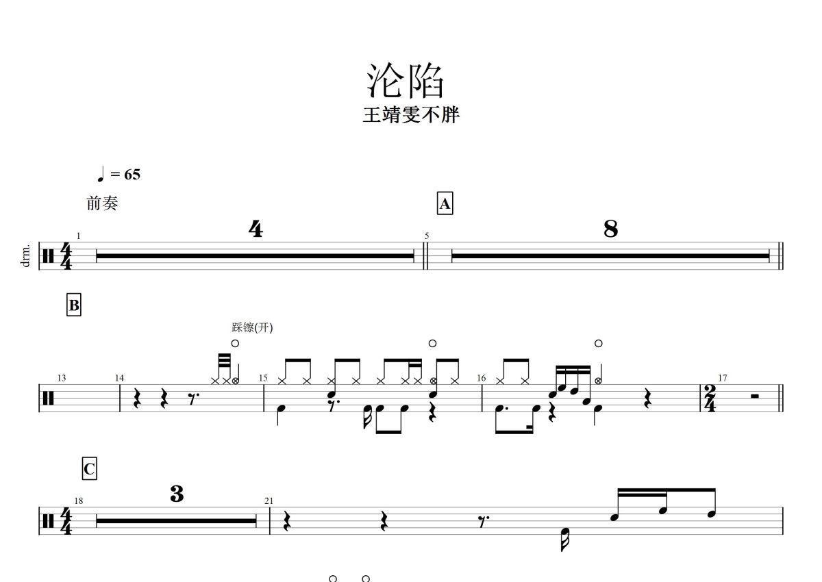 《沦陷》是王靖雯不胖演唱的一首歌曲,这份鼓谱共有两张高清图谱,图谱由 @打鼓谱 编配上传,图谱使用五线谱编配,使用这份沦陷架子鼓谱,你将能够轻松地敲打出这首王靖雯不胖的沦陷,快来尝试吧。《沦陷》,是由乔与作词,楚明玉作曲,王靖雯不胖演唱的歌曲,发布于2021年2月26日。 。