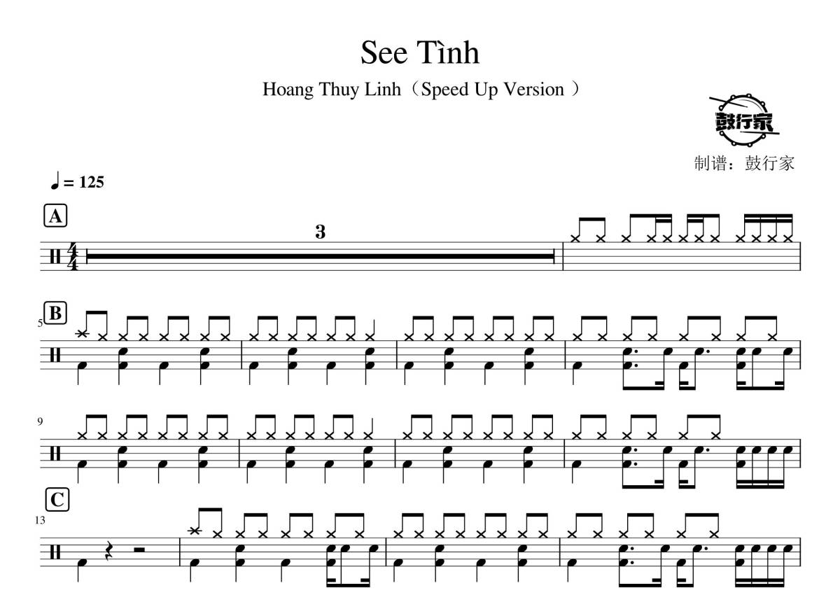 《see tinh》是Hoang Thuy Linh (Speed Up Version )演唱的一首歌曲,拍号为4/4拍,歌曲速度为每分钟125拍,这份鼓谱共有两张高清图谱,图谱由 @鼓行家 编配上传,图谱使用五线谱编配,使用这份see tinh架子鼓谱,你将能够轻松地敲打出这首Hoang Thuy Linh (Speed Up Version )的see tinh,快来尝试吧。