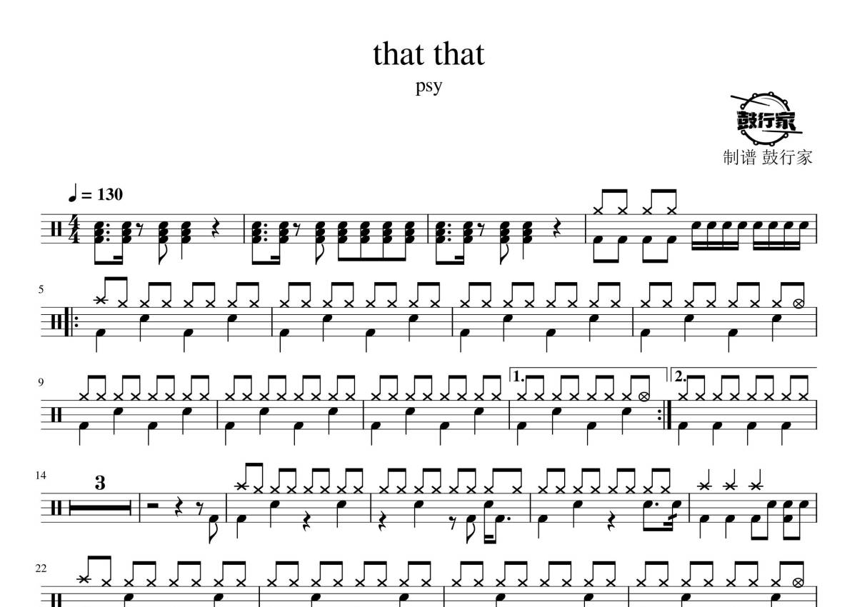 《that that》是psy演唱的一首歌曲,拍号为4/4拍,歌曲速度为每分钟130拍,这份鼓谱共有两张高清图谱,图谱由 @鼓行家 编配上传,图谱使用五线谱编配,使用这份that that架子鼓谱,你将能够轻松地敲打出这首psy的that that,快来尝试吧。