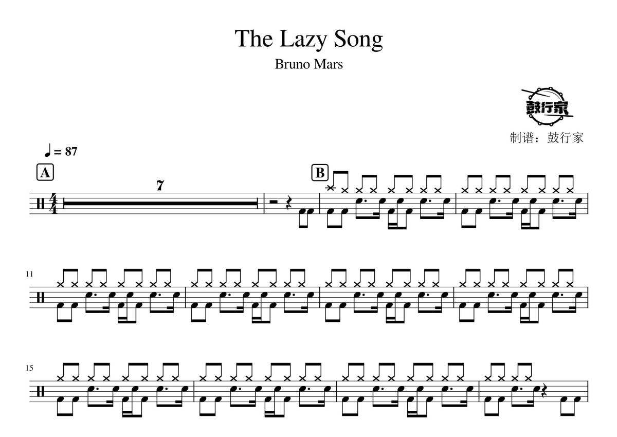 《the lazy song》是Bruno Mars演唱的一首歌曲,拍号为4/4拍,歌曲速度为每分钟87拍,这份鼓谱共有两张高清图谱,图谱由 @鼓行家 编配上传,图谱使用五线谱编配,使用这份the lazy song架子鼓谱,你将能够轻松地敲打出这首Bruno Mars的the lazy song,快来尝试吧。