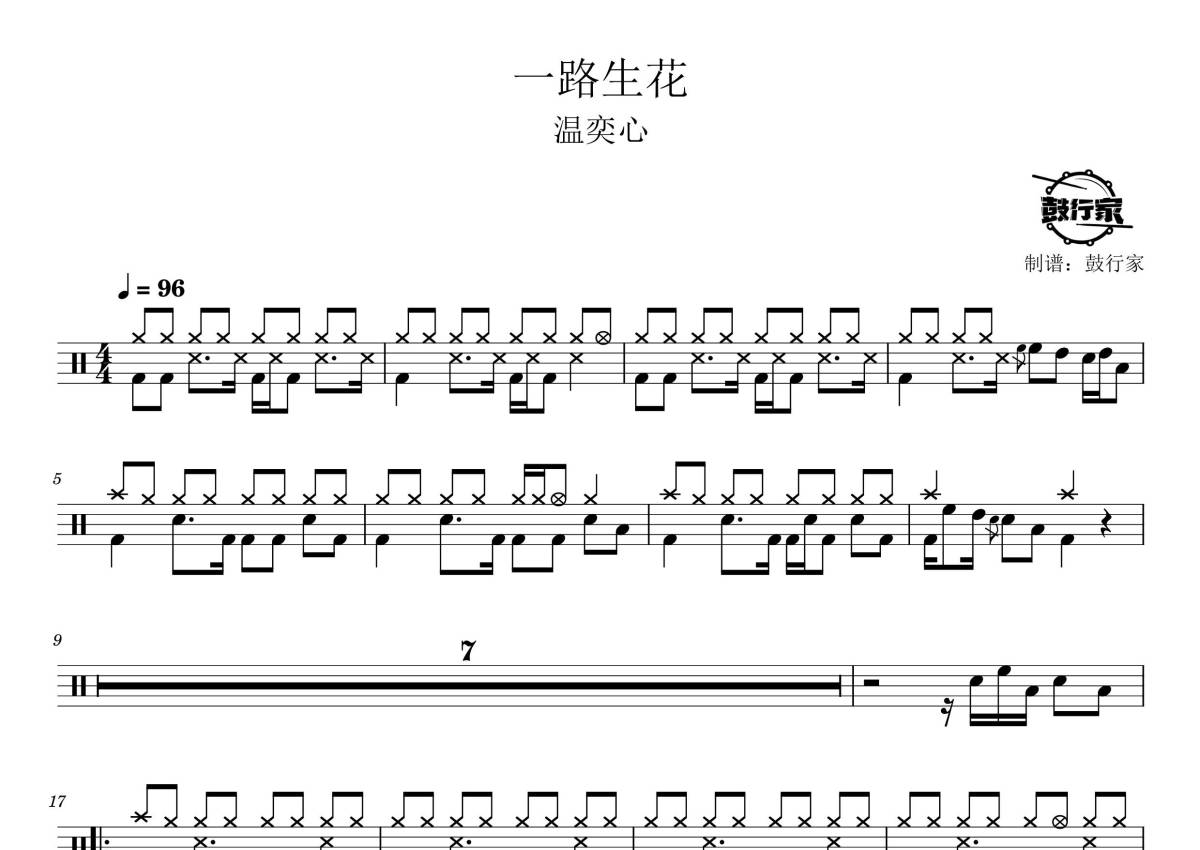 温奕心《一路生花》鼓谱 - 架子鼓谱
