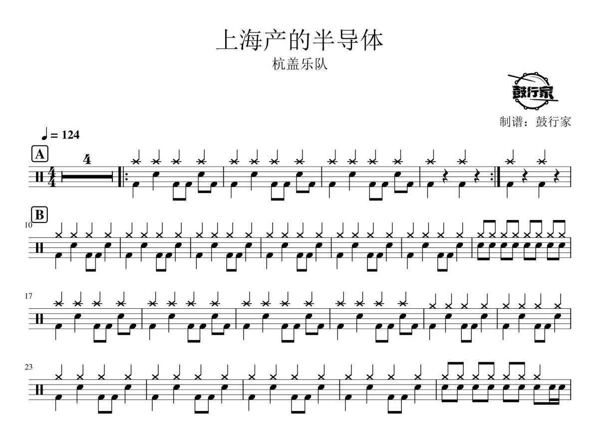 《上海产的半导体》是杭盖乐队演唱的一首歌曲,拍号为4/4拍,歌曲速度为每分钟124拍,这份鼓谱共有两张高清图谱,图谱由 @鼓行家 编配上传,图谱使用五线谱编配,使用这份上海产的半导体架子鼓谱,你将能够轻松地敲打出这首杭盖乐队的上海产的半导体,快来尝试吧。