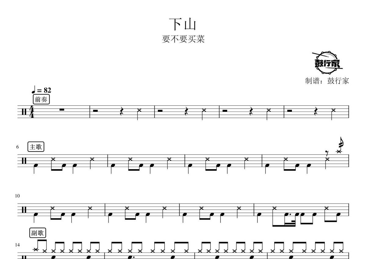 《下山》是要不要买菜演唱的一首歌曲,拍号为4/4拍,歌曲速度为每分钟82拍,这份鼓谱共有两张高清图谱,图谱由 @鼓行家 编配上传,图谱使用五线谱编配,使用这份下山架子鼓谱,你将能够轻松地敲打出这首要不要买菜的下山,快来尝试吧。