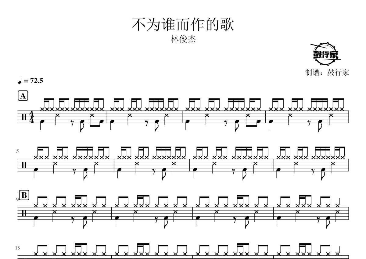 《不为谁而作的歌》是林俊杰演唱的一首歌曲,拍号为4/4拍,歌曲速度为每分钟72拍,这份鼓谱共有两张高清图谱,图谱由 @鼓行家 编配上传,图谱使用五线谱编配,使用这份不为谁而作的歌架子鼓谱,你将能够轻松地敲打出这首林俊杰的不为谁而作的歌,快来尝试吧。