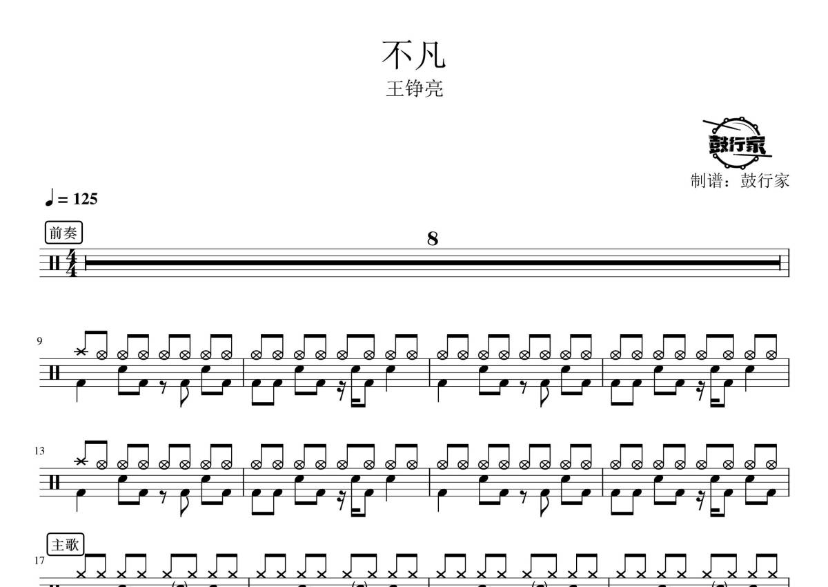 《不凡》是王铮亮演唱的一首歌曲,拍号为4/4拍,歌曲速度为每分钟125拍,这份鼓谱共有三张高清图谱,图谱由 @鼓行家 编配上传,图谱使用五线谱编配,使用这份不凡架子鼓谱,你将能够轻松地敲打出这首王铮亮的不凡,快来尝试吧。