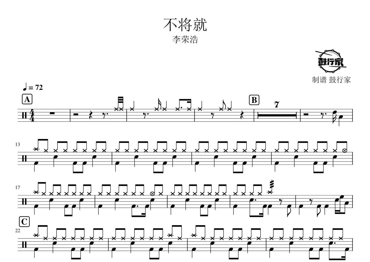 李荣浩《不将就》鼓谱 - 架子鼓谱