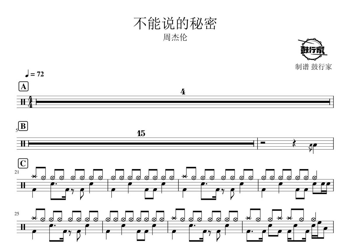 《不能说的秘密》是周杰伦演唱的一首歌曲,拍号为4/4拍,歌曲速度为每分钟72拍,这份鼓谱共有两张高清图谱,图谱由 @鼓行家 编配上传,图谱使用五线谱编配,使用这份不能说的秘密架子鼓谱,你将能够轻松地敲打出这首周杰伦的不能说的秘密,快来尝试吧。