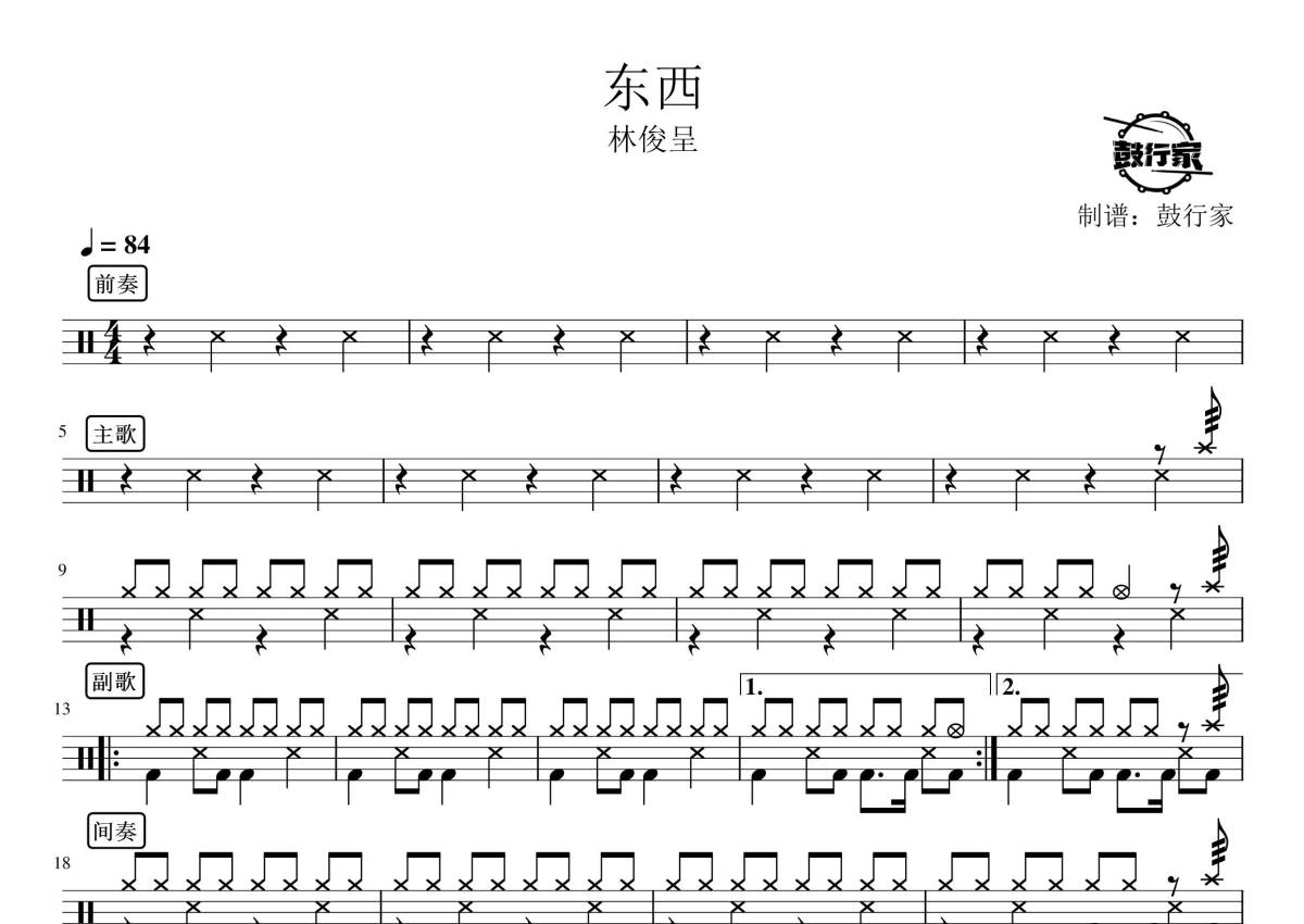 《东西》是林俊呈演唱的一首歌曲,拍号为4/4拍,歌曲速度为每分钟84拍,这份鼓谱共有一张高清图谱,图谱由 @鼓行家 编配上传,图谱使用五线谱编配,使用这份东西架子鼓谱,你将能够轻松地敲打出这首林俊呈的东西,快来尝试吧。