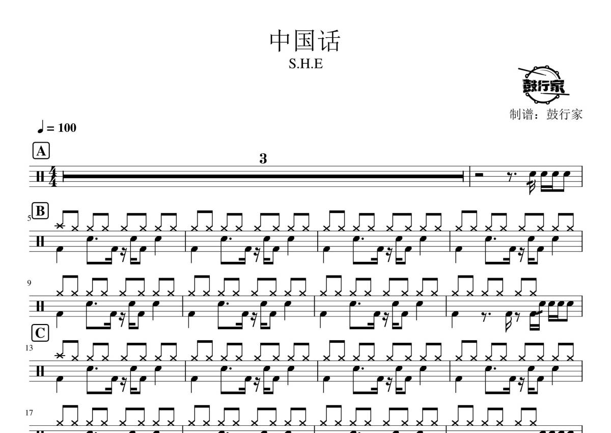 《中国话》是S.H.E演唱的一首歌曲,拍号为4/4拍,歌曲速度为每分钟100拍,这份鼓谱共有两张高清图谱,图谱由 @鼓行家 编配上传,图谱使用五线谱编配,使用这份中国话架子鼓谱,你将能够轻松地敲打出这首S.H.E的中国话,快来尝试吧。