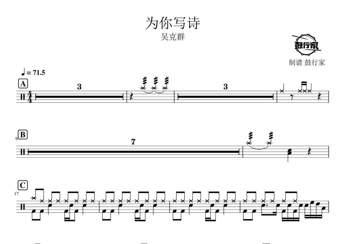 《为你写诗》是吴克群演唱的一首歌曲,拍号为4/4拍,歌曲速度为每分钟71拍,这份鼓谱共有两张高清图谱,图谱由 @鼓行家 编配上传,图谱使用五线谱编配,使用这份为你写诗架子鼓谱,你将能够轻松地敲打出这首吴克群的为你写诗,快来尝试吧。