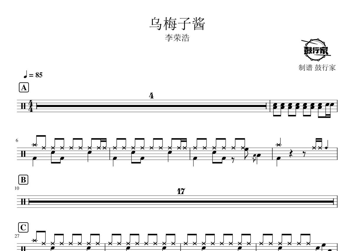《乌梅子酱》是李荣浩演唱的一首歌曲,拍号为4/4拍,歌曲速度为每分钟85拍,这份鼓谱共有两张高清图谱,图谱由 @鼓行家 编配上传,图谱使用五线谱编配,使用这份乌梅子酱架子鼓谱,你将能够轻松地敲打出这首李荣浩的乌梅子酱,快来尝试吧。