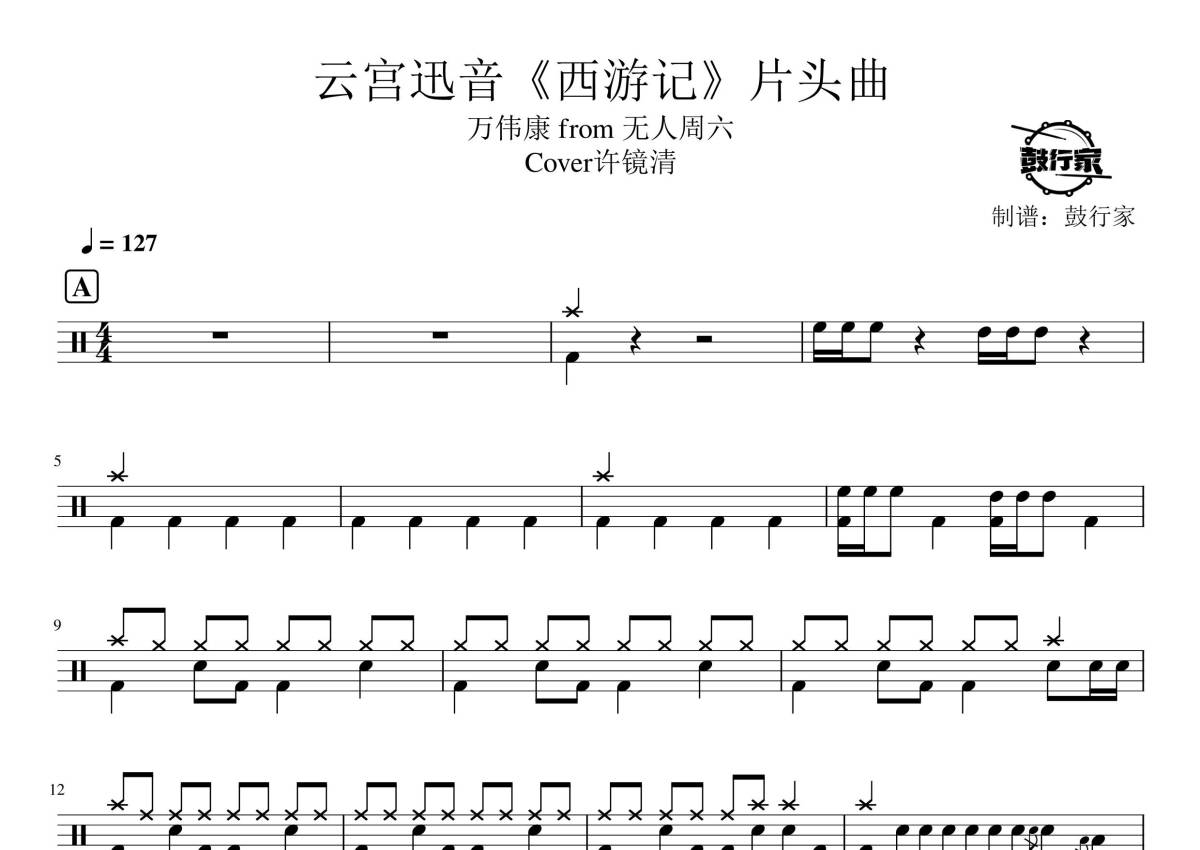 《云宫迅音》是西游记演唱的一首歌曲,拍号为4/4拍,歌曲速度为每分钟127拍,这份鼓谱共有两张高清图谱,图谱由 @鼓行家 编配上传,图谱使用五线谱编配,使用这份云宫迅音架子鼓谱,你将能够轻松地敲打出这首西游记的云宫迅音,快来尝试吧。万伟康from 无人周六 Cover许镜清。