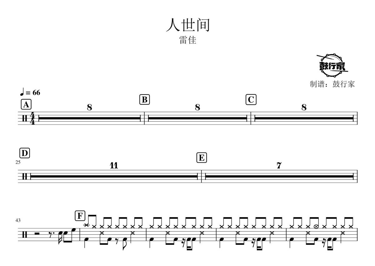 《人世间》是雷佳演唱的一首歌曲,拍号为4/4拍,歌曲速度为每分钟66拍,这份鼓谱共有一张高清图谱,图谱由 @鼓行家 编配上传,图谱使用五线谱编配,使用这份人世间架子鼓谱,你将能够轻松地敲打出这首雷佳的人世间,快来尝试吧。