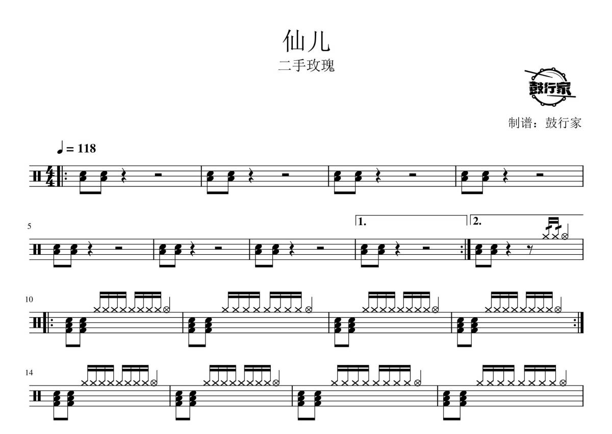 《仙儿》是二手玫瑰演唱的一首歌曲,拍号为4/4拍,歌曲速度为每分钟118拍,这份鼓谱共有三张高清图谱,图谱由 @鼓行家 编配上传,图谱使用五线谱编配,使用这份仙儿架子鼓谱,你将能够轻松地敲打出这首二手玫瑰的仙儿,快来尝试吧。