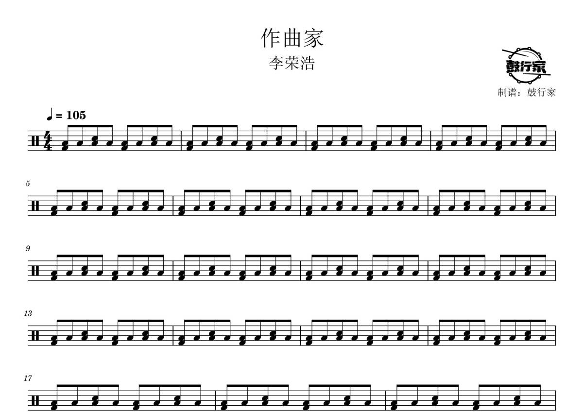 《作曲家》是李荣浩演唱的一首歌曲,拍号为4/4拍,歌曲速度为每分钟105拍,这份鼓谱共有两张高清图谱,图谱由 @鼓行家 编配上传,图谱使用五线谱编配,使用这份作曲家架子鼓谱,你将能够轻松地敲打出这首李荣浩的作曲家,快来尝试吧。