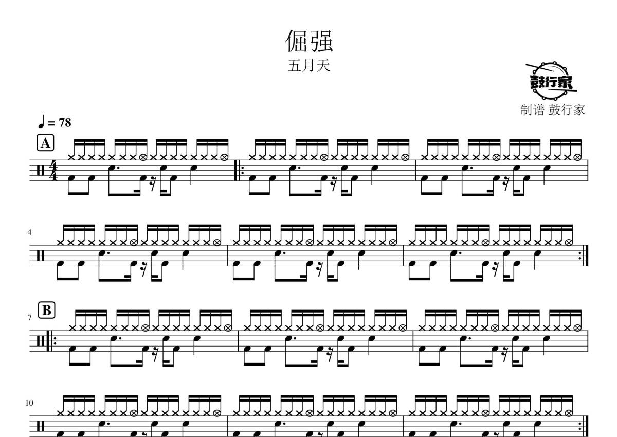 《倔强》是五月天演唱的一首歌曲,拍号为4/4拍,歌曲速度为每分钟78拍,这份鼓谱共有两张高清图谱,图谱由 @鼓行家 编配上传,图谱使用五线谱编配,使用这份倔强架子鼓谱,你将能够轻松地敲打出这首五月天的倔强,快来尝试吧。