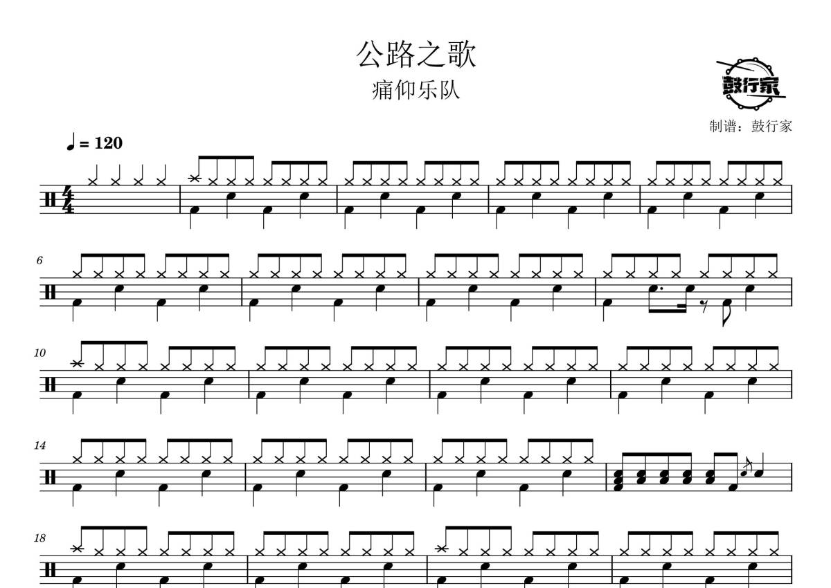 《公路之歌》是痛仰乐队演唱的一首歌曲,拍号为4/4拍,歌曲速度为每分钟120拍,这份鼓谱共有两张高清图谱,图谱由 @鼓行家 编配上传,图谱使用五线谱编配,使用这份公路之歌架子鼓谱,你将能够轻松地敲打出这首痛仰乐队的公路之歌,快来尝试吧。