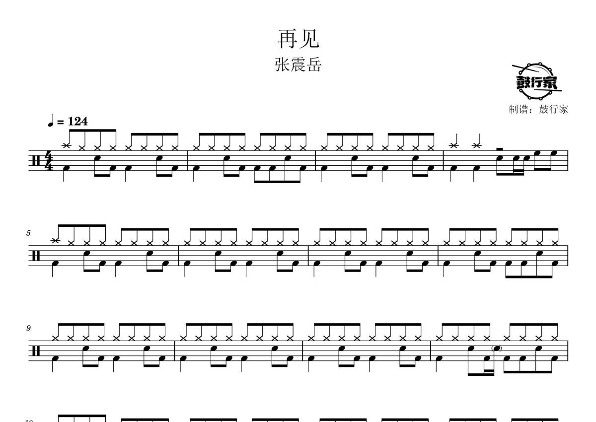 《再见》是张震岳演唱的一首歌曲,拍号为4/4拍,歌曲速度为每分钟124拍,这份鼓谱共有三张高清图谱,图谱由 @鼓行家 编配上传,图谱使用五线谱编配,使用这份再见架子鼓谱,你将能够轻松地敲打出这首张震岳的再见,快来尝试吧。