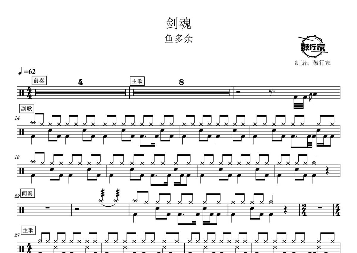 《剑魂》是鱼多余演唱的一首歌曲,拍号为4/4拍,歌曲速度为每分钟62拍,这份鼓谱共有一张高清图谱,图谱由 @鼓行家 编配上传,图谱使用五线谱编配,使用这份剑魂架子鼓谱,你将能够轻松地敲打出这首鱼多余的剑魂,快来尝试吧。