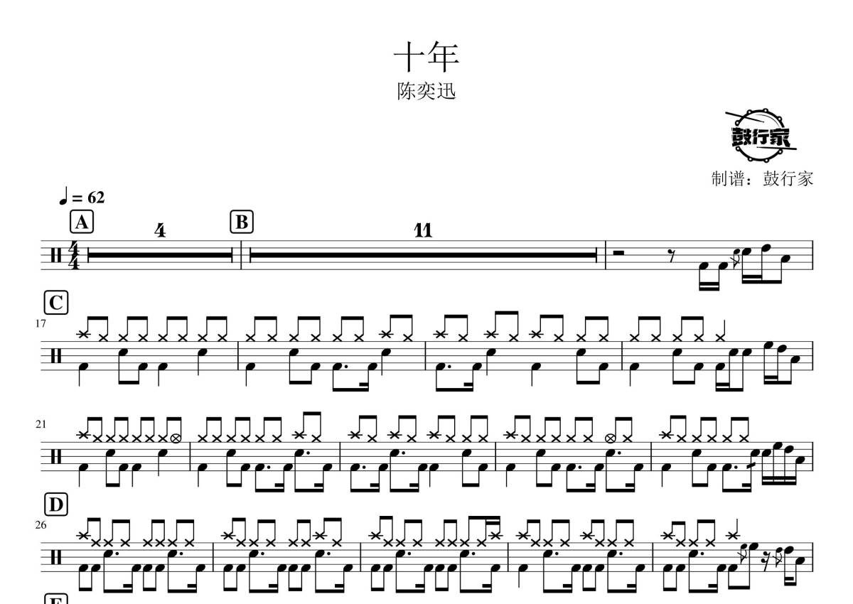 《十年》是陈奕迅演唱的一首歌曲,拍号为4/4拍,歌曲速度为每分钟62拍,这份鼓谱共有一张高清图谱,图谱由 @鼓行家 编配上传,图谱使用五线谱编配,使用这份十年架子鼓谱,你将能够轻松地敲打出这首陈奕迅的十年,快来尝试吧。
