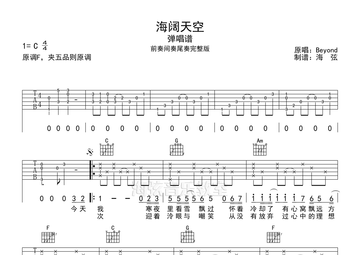 《海阔天空》是Beyond演唱的一首歌曲,前奏间奏尾奏完整版,拍号为4/4拍,歌曲原调为F调,但由于原调指法比较难,为了方便弹奏,本吉他谱采用的是C调指法编配,变调夹5品弹奏即为原调,当然也可以根据自己的音域改变变调夹位置,或者通过改变和弦调性,以方便自己弹奏,这份吉他谱共有四张高清图谱,图谱由 @海弦 编配上传,图谱使用六线谱编配,包含吉他和弦指法、简谱以及歌词部分,使用这份海阔天空吉他谱,可以让你更加方便地掌握这首歌曲的弹唱技巧,快来尝试吧。海阔天空弹唱吉他六线谱,前奏间奏尾奏完整版,来自海弦编配,选调C调,夹5品则原调,琴友可根据自己音域选择变调夹品位。