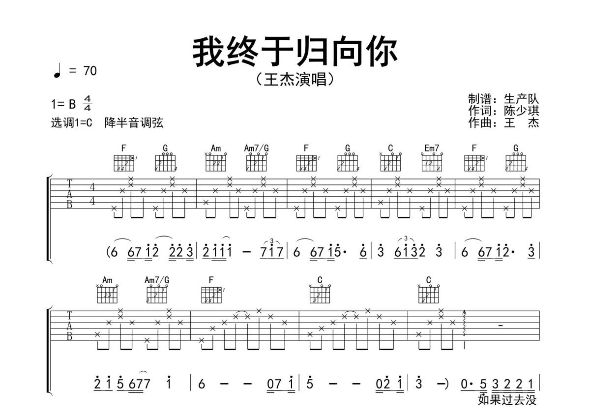 《我终于归向你》是王杰演唱的一首歌曲,精编完美版,拍号为4/4拍,歌曲速度为每分钟70拍,歌曲原调为B调,但由于原调指法比较难,为了方便弹奏,本吉他谱采用的是C调指法编配,降半音调弦弹奏即为原调,当然也可以根据自己的音域决定是否调弦,这份吉他谱共有三张高清图谱,图谱由 @生产队 编配上传,图谱使用六线谱编配,包含吉他和弦指法、简谱以及歌词部分,使用这份我终于归向你吉他谱,可以让你更加方便地掌握这首歌曲的弹唱技巧,快来尝试吧。《我终于归向你》是王杰演唱的一首粤语歌曲,由陈少琪作词、王杰作曲,Ricky Ho编曲,收录在粤语专辑《一生心碎》中。本吉他谱根据原版C调指法编配,完整的前奏、间奏、尾奏及solo编配,怀旧粤语经典!。