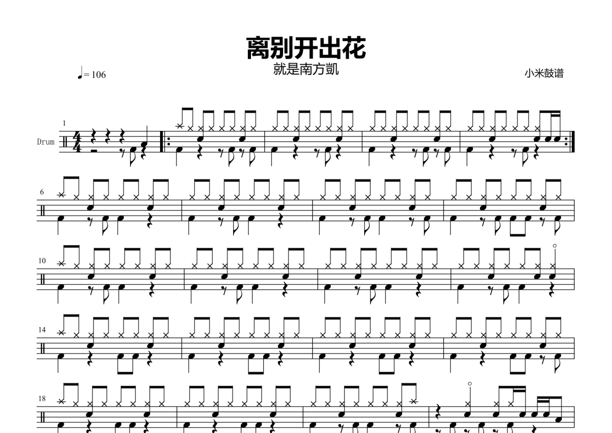 《离别开出花》是就是南方凯演唱的一首歌曲,拍号为4/4拍,歌曲速度为每分钟106拍,这份鼓谱共有两张高清图谱,图谱由 @小米鼓谱 编配上传,图谱使用五线谱编配,使用这份离别开出花架子鼓谱,你将能够轻松地敲打出这首就是南方凯的离别开出花,快来尝试吧。