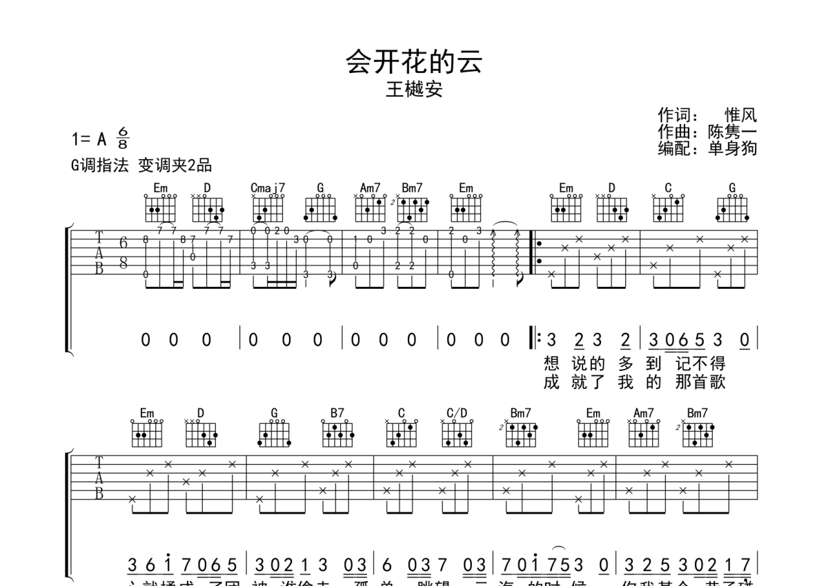 《会开花的云》是王樾安演唱的一首歌曲,拍号为6/8拍,歌曲原调为A调,但由于原调指法比较难,为了方便弹奏,本吉他谱采用的是G调指法编配,变调夹2品弹奏即为原调,当然也可以根据自己的音域改变变调夹位置,或者通过改变和弦调性,以方便自己弹奏,这份吉他谱共有两张高清图谱,图谱由 @单身狗 编配上传,图谱使用六线谱编配,包含吉他和弦指法、简谱以及歌词部分,使用这份会开花的云吉他谱,可以让你更加方便地掌握这首歌曲的弹唱技巧,快来尝试吧。