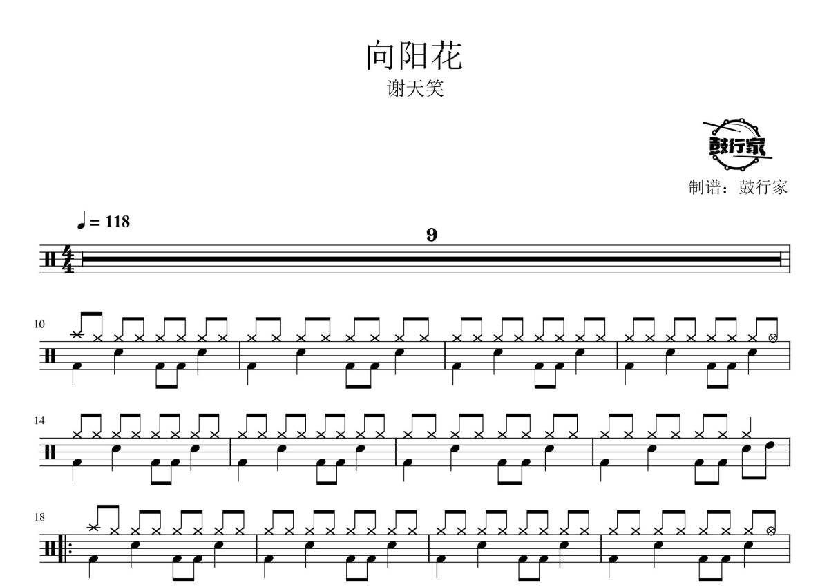 《向阳花》是谢天笑演唱的一首歌曲,拍号为4/4拍,歌曲速度为每分钟118拍,这份鼓谱共有三张高清图谱,图谱由 @鼓行家 编配上传,图谱使用五线谱编配,使用这份向阳花架子鼓谱,你将能够轻松地敲打出这首谢天笑的向阳花,快来尝试吧。
