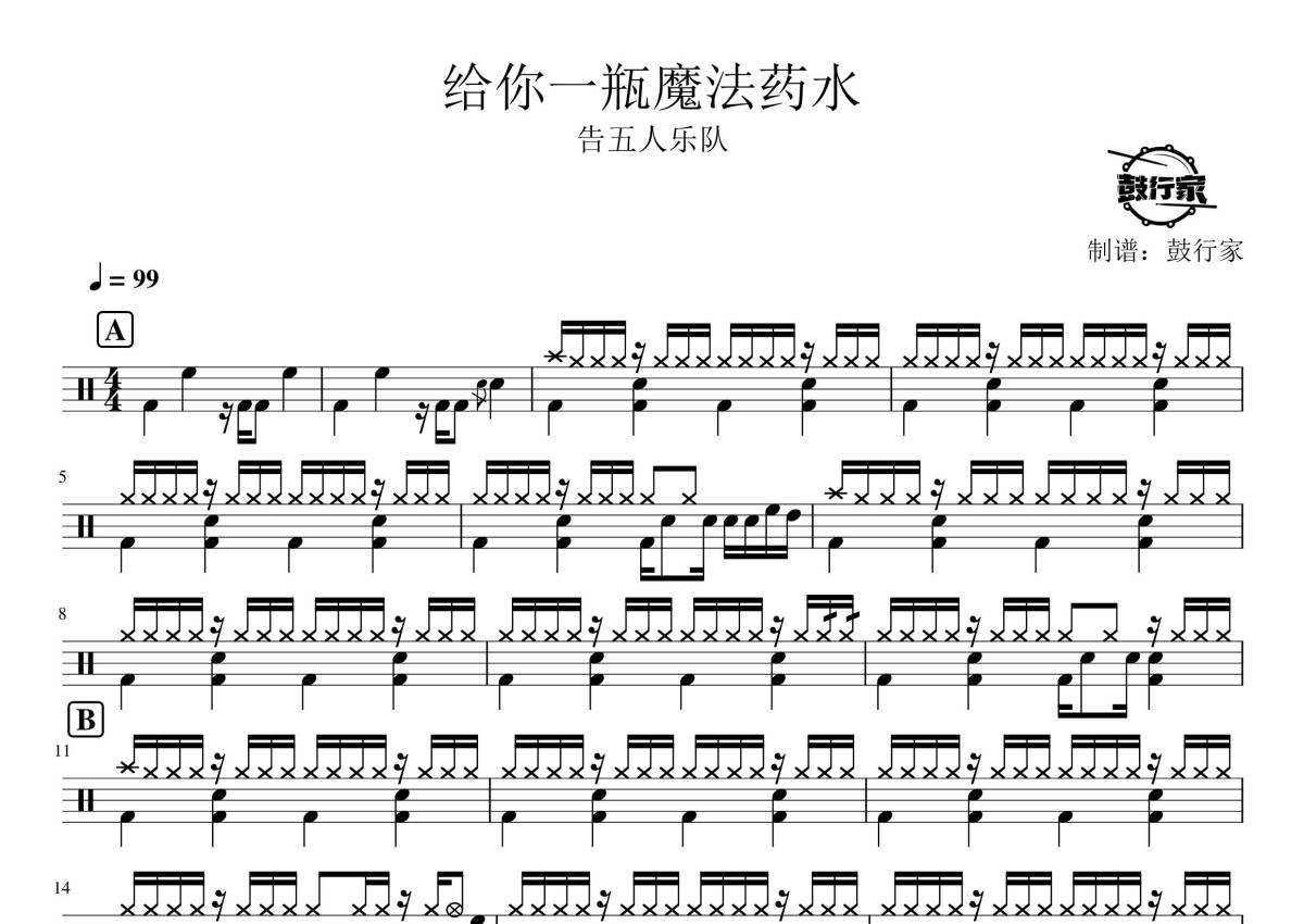 告五人乐队《给你一瓶魔法药水》鼓谱 - 架子鼓谱