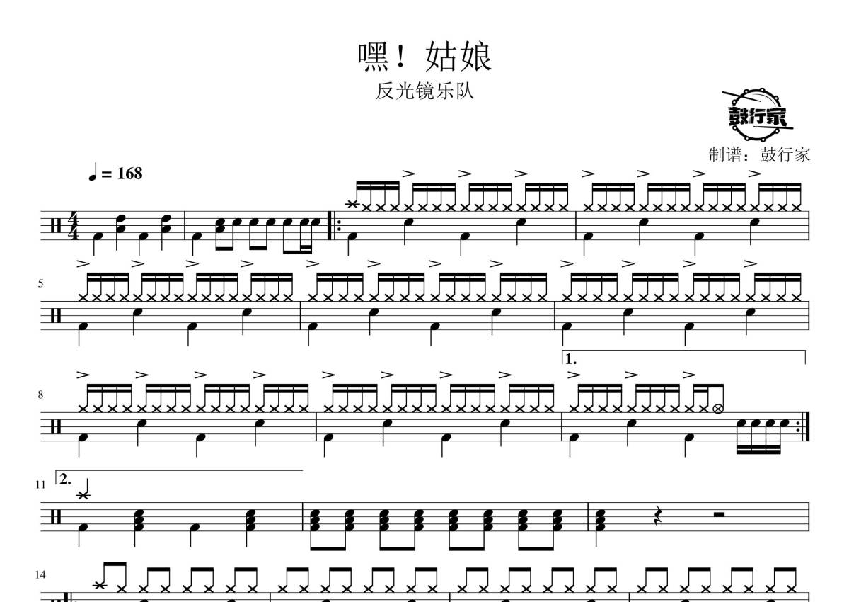 《嘿!姑娘》是反光镜乐队演唱的一首歌曲,拍号为4/4拍,歌曲速度为每分钟168拍,这份鼓谱共有三张高清图谱,图谱由 @鼓行家 编配上传,图谱使用五线谱编配,使用这份嘿!姑娘架子鼓谱,你将能够轻松地敲打出这首反光镜乐队的嘿!姑娘,快来尝试吧。
