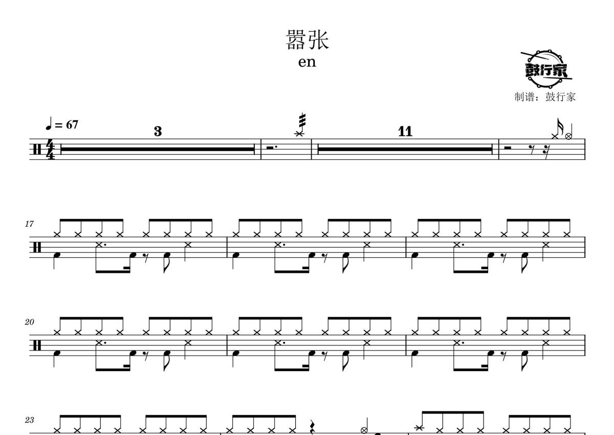 《嚣张》是en演唱的一首歌曲,拍号为4/4拍,歌曲速度为每分钟67拍,这份鼓谱共有两张高清图谱,图谱由 @鼓行家 编配上传,图谱使用五线谱编配,使用这份嚣张架子鼓谱,你将能够轻松地敲打出这首en的嚣张,快来尝试吧。