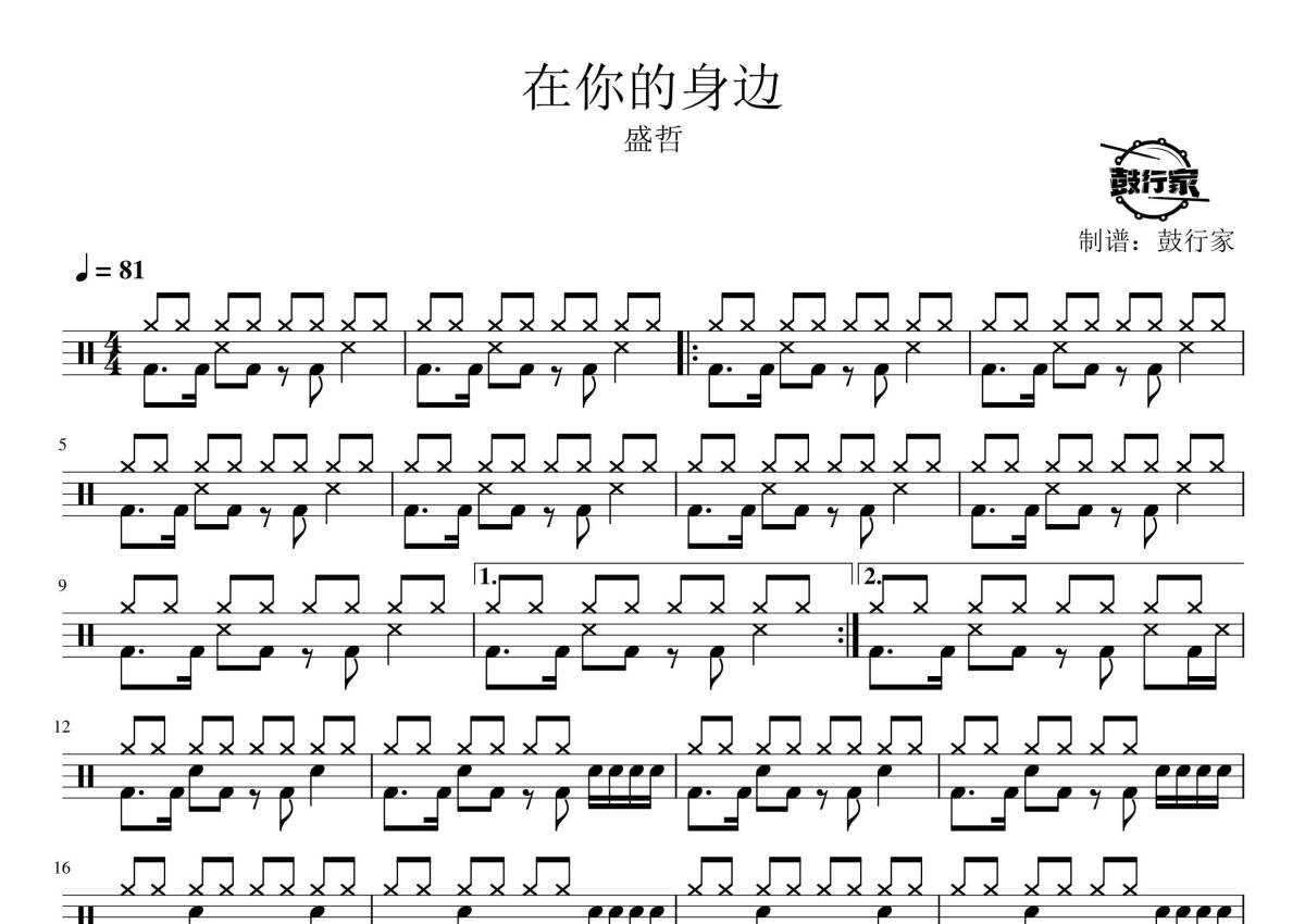 《在你的身边》是盛哲演唱的一首歌曲,拍号为4/4拍,歌曲速度为每分钟81拍,这份鼓谱共有两张高清图谱,图谱由 @鼓行家 编配上传,图谱使用五线谱编配,使用这份在你的身边架子鼓谱,你将能够轻松地敲打出这首盛哲的在你的身边,快来尝试吧。