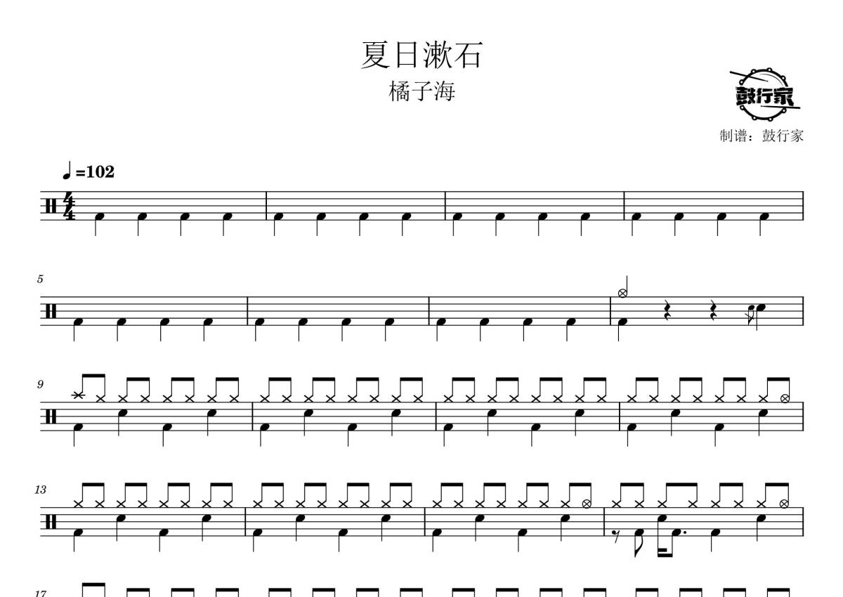 《夏日漱石》是橘子海乐队演唱的一首歌曲,拍号为4/4拍,歌曲速度为每分钟102拍,这份鼓谱共有三张高清图谱,图谱由 @鼓行家 编配上传,图谱使用五线谱编配,使用这份夏日漱石架子鼓谱,你将能够轻松地敲打出这首橘子海乐队的夏日漱石,快来尝试吧。