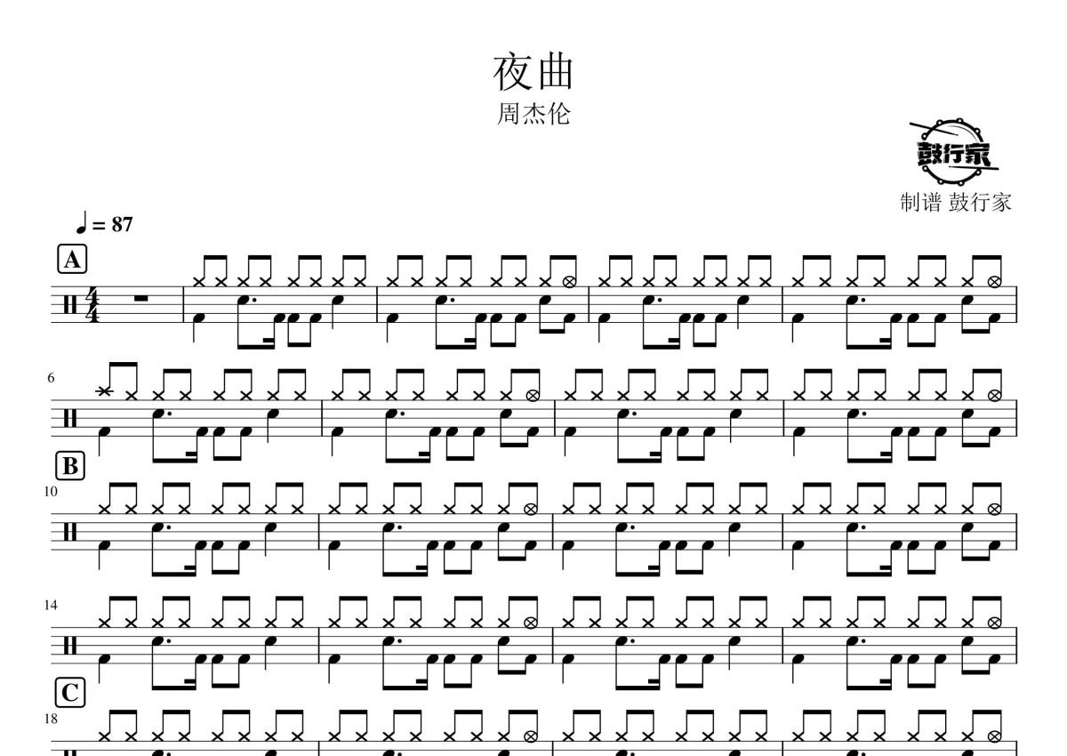 《夜曲》是周杰伦演唱的一首歌曲,拍号为4/4拍,歌曲速度为每分钟87拍,这份鼓谱共有两张高清图谱,图谱由 @鼓行家 编配上传,图谱使用五线谱编配,使用这份夜曲架子鼓谱,你将能够轻松地敲打出这首周杰伦的夜曲,快来尝试吧。