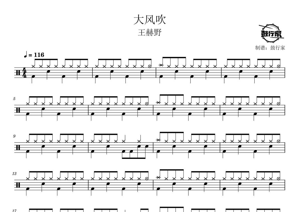 《大风吹》是王赫野演唱的一首歌曲,拍号为4/4拍,歌曲速度为每分钟116拍,这份鼓谱共有两张高清图谱,图谱由 @鼓行家 编配上传,图谱使用五线谱编配,使用这份大风吹架子鼓谱,你将能够轻松地敲打出这首王赫野的大风吹,快来尝试吧。