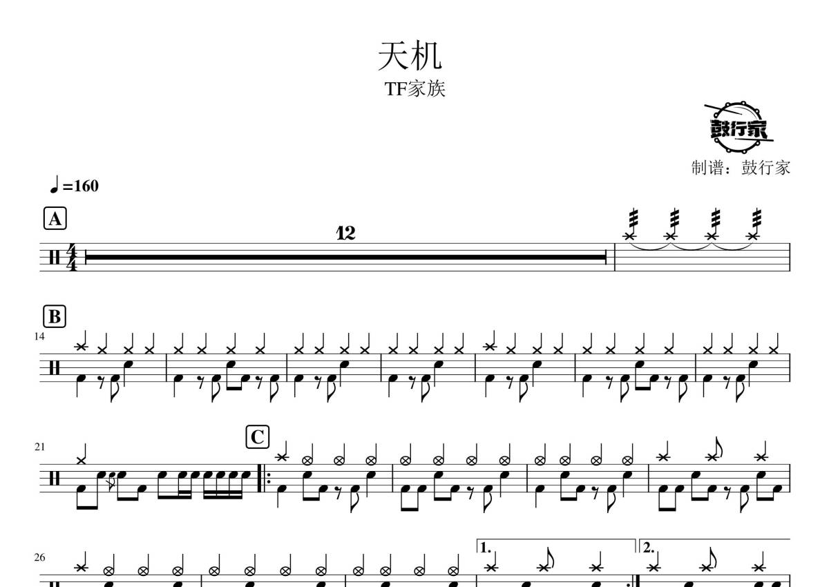 《天机》是TF家族演唱的一首歌曲,拍号为4/4拍,歌曲速度为每分钟160拍,这份鼓谱共有三张高清图谱,图谱由 @鼓行家 编配上传,图谱使用五线谱编配,使用这份天机架子鼓谱,你将能够轻松地敲打出这首TF家族的天机,快来尝试吧。