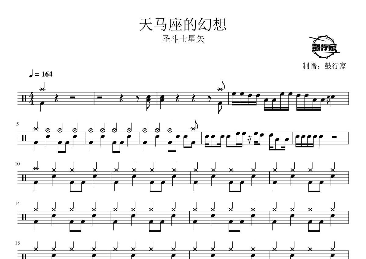 《天马座的幻想》是圣斗士星矢演唱的一首歌曲,拍号为4/4拍,歌曲速度为每分钟164拍,这份鼓谱共有三张高清图谱,图谱由 @鼓行家 编配上传,图谱使用五线谱编配,使用这份天马座的幻想架子鼓谱,你将能够轻松地敲打出这首圣斗士星矢的天马座的幻想,快来尝试吧。