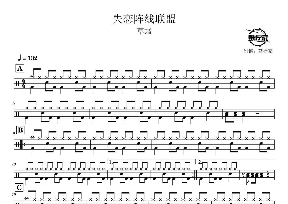 《失恋阵线联盟》是草蜢乐队演唱的一首歌曲,拍号为4/4拍,歌曲速度为每分钟132拍,这份鼓谱共有两张高清图谱,图谱由 @鼓行家 编配上传,图谱使用五线谱编配,使用这份失恋阵线联盟架子鼓谱,你将能够轻松地敲打出这首草蜢乐队的失恋阵线联盟,快来尝试吧。