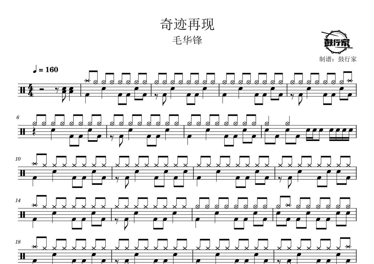 《奇迹再现》是毛华锋演唱的一首歌曲,拍号为4/4拍,歌曲速度为每分钟160拍,这份鼓谱共有三张高清图谱,图谱由 @鼓行家 编配上传,图谱使用五线谱编配,使用这份奇迹再现架子鼓谱,你将能够轻松地敲打出这首毛华锋的奇迹再现,快来尝试吧。