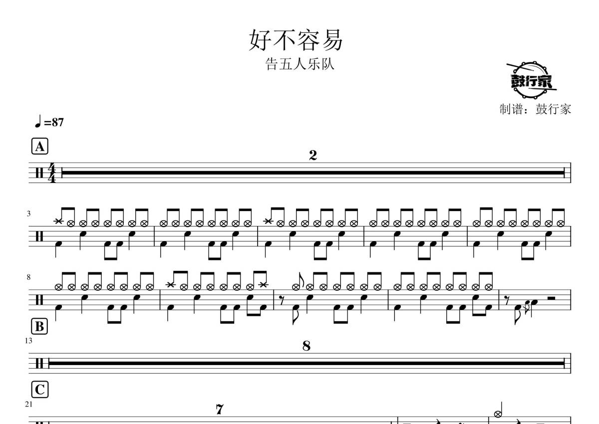 《好不容易》是告五人演唱的一首歌曲,拍号为4/4拍,歌曲速度为每分钟87拍,这份鼓谱共有两张高清图谱,图谱由 @鼓行家 编配上传,图谱使用五线谱编配,使用这份好不容易架子鼓谱,你将能够轻松地敲打出这首告五人的好不容易,快来尝试吧。